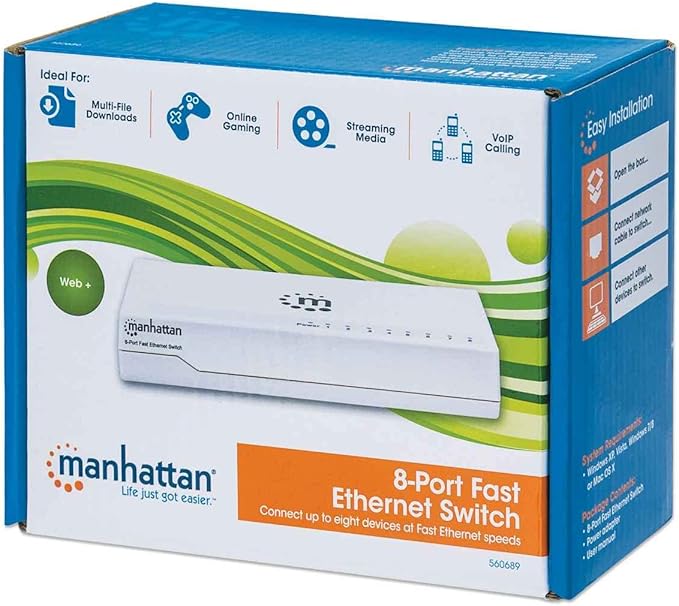The Manhattan 8-Port Fast Ethernet Switch is perfect for the home environment and small-size business looking for a durable switch that is reliable and easy to install.